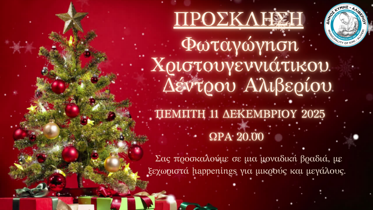 Ανακοινώνεται ότι η φωταγώγηση του Χριστουγεννιάτικου Δέντρου στο Αλιβέρι, που είχε προγραμματιστεί για αύριο, Παρασκευή 8 Δεκεμβρίου, αναβάλλεται λόγω καιρικών συνθηκών!