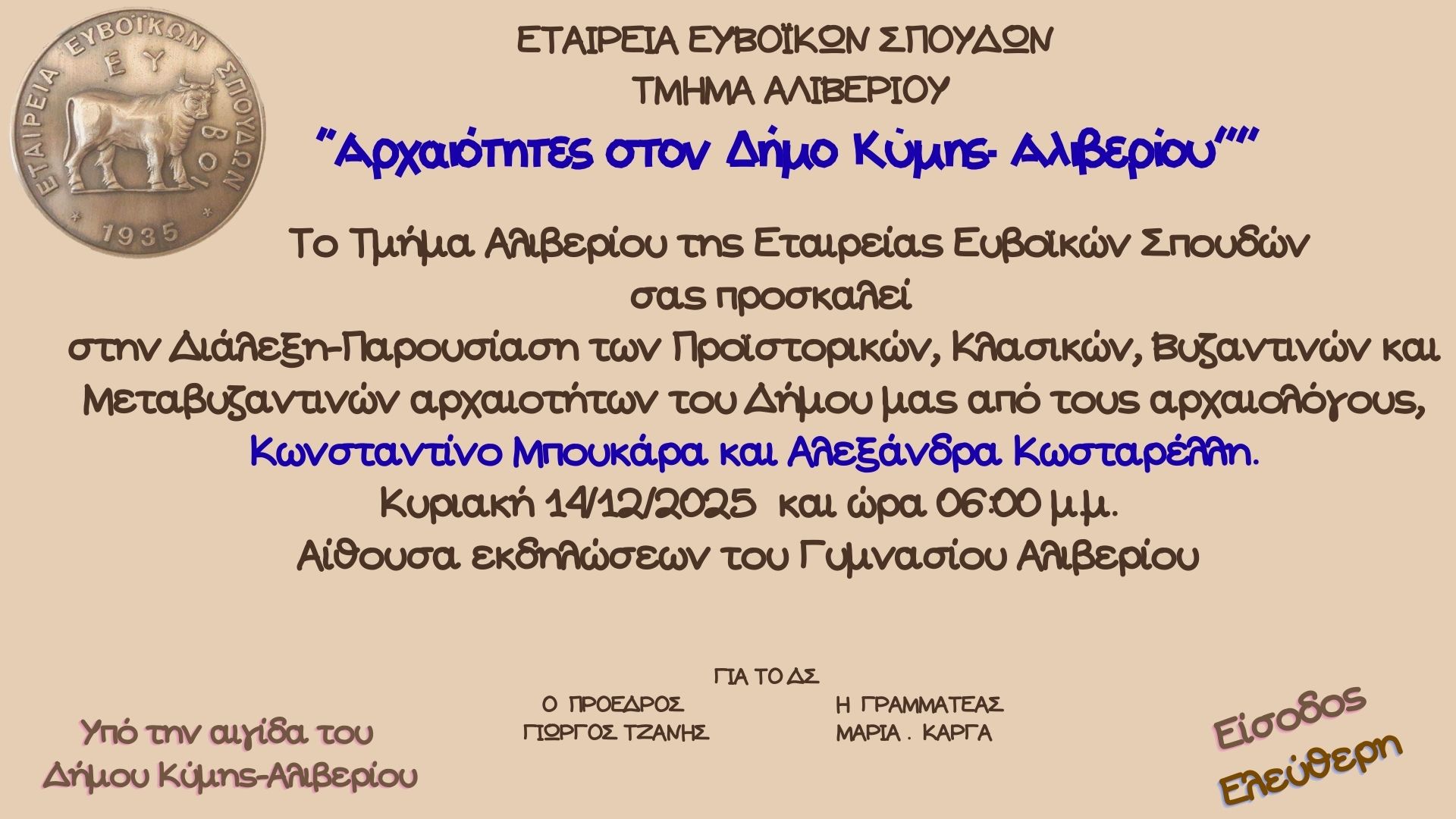 Η εκδήλωση θα πραγματοποιηθεί στην Αίθουσα εκδηλώσεων του Γυμνασίου Αλιβερίου την Κυριακή 14 Δεκεμβρίου 2025 και ώρα 18:00.
