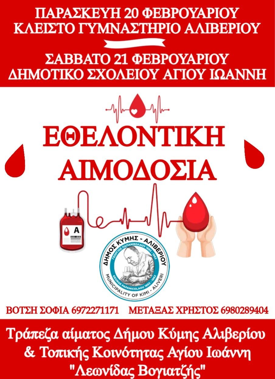 Ο Δήμος Κύμης–Αλιβερίου, σε συνεργασία με την Τοπική Κοινότητα Αγίου Ιωάννη και το Τμήμα Αιμοδοσίας του Γενικού Κρατικού Νοσοκομείου Αθηνών «Γεώργιος Γεννηματάς», διοργανώνουν εθελοντική αιμοδοσία για την ενίσχυση της Τράπεζας Αίματος «Λεωνίδας Βογιατζής».