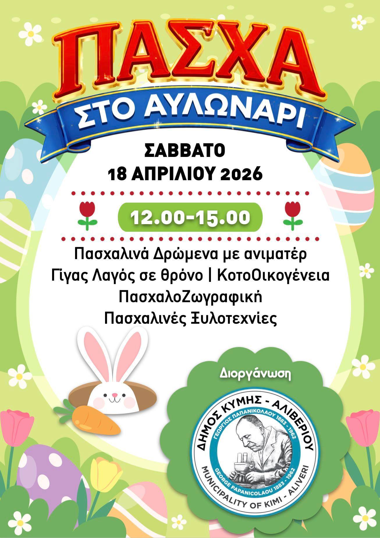 Πασχαλινή γιορτή στο Αυλωνάρι Πληροφορίες Εκδήλωσης Date: 18/04/2026 12:00 μμ – 3:00 μμ Η πασχαλινή γιορτή του Αυλωναρίου αναβλήθηκε λόγω καιρού. Νέα ημερομηνία το Σάββατο 18 Απριλίου. Όλοι μικροί και μεγάλοι ραντεβού στο ίδιο σημείο, στον Άγιο Δημήτριο στα Χάνια Αυλωναρίου.