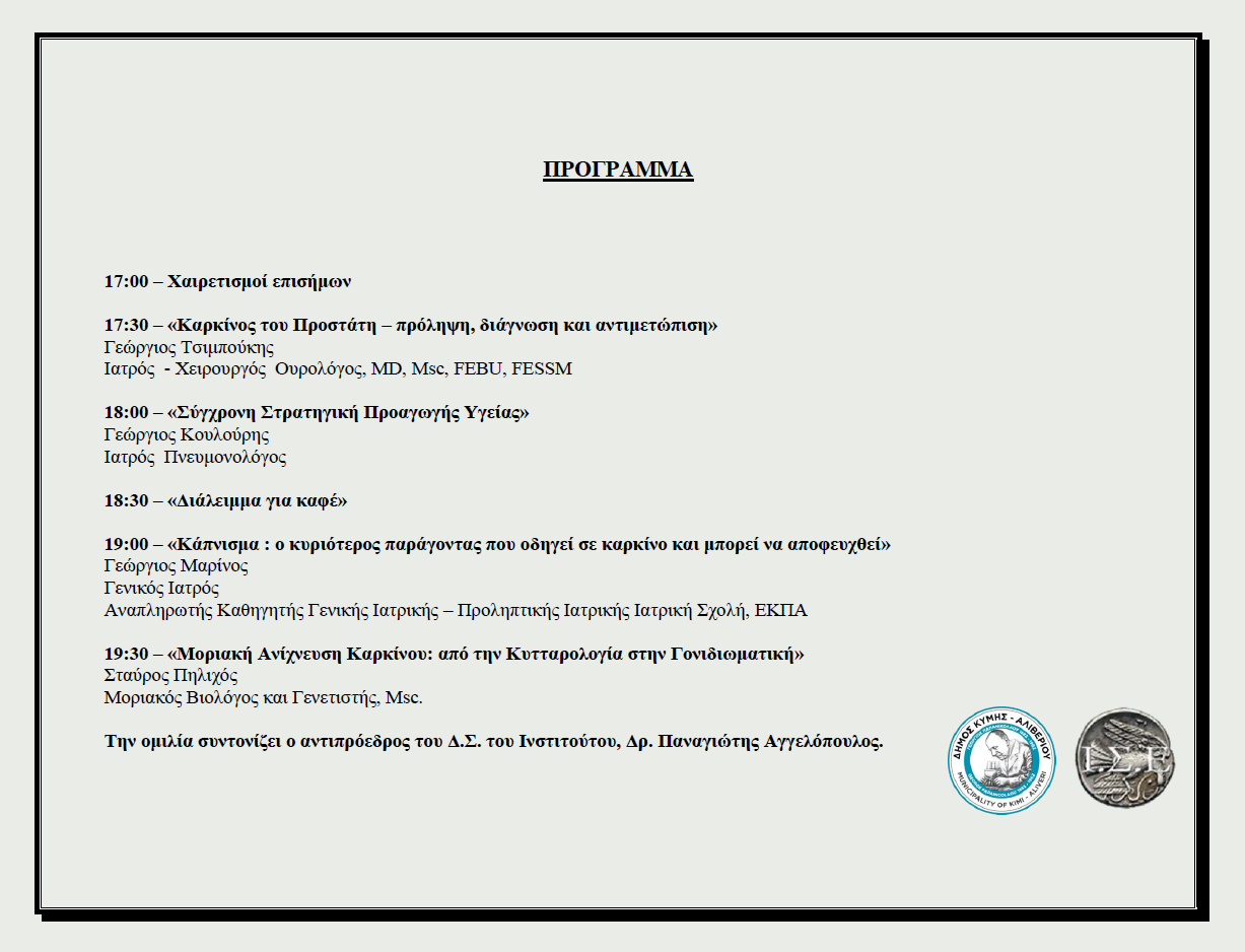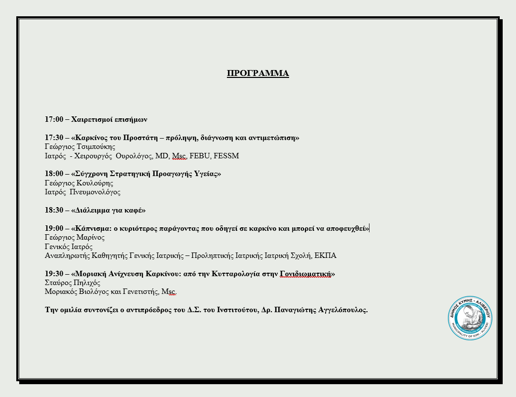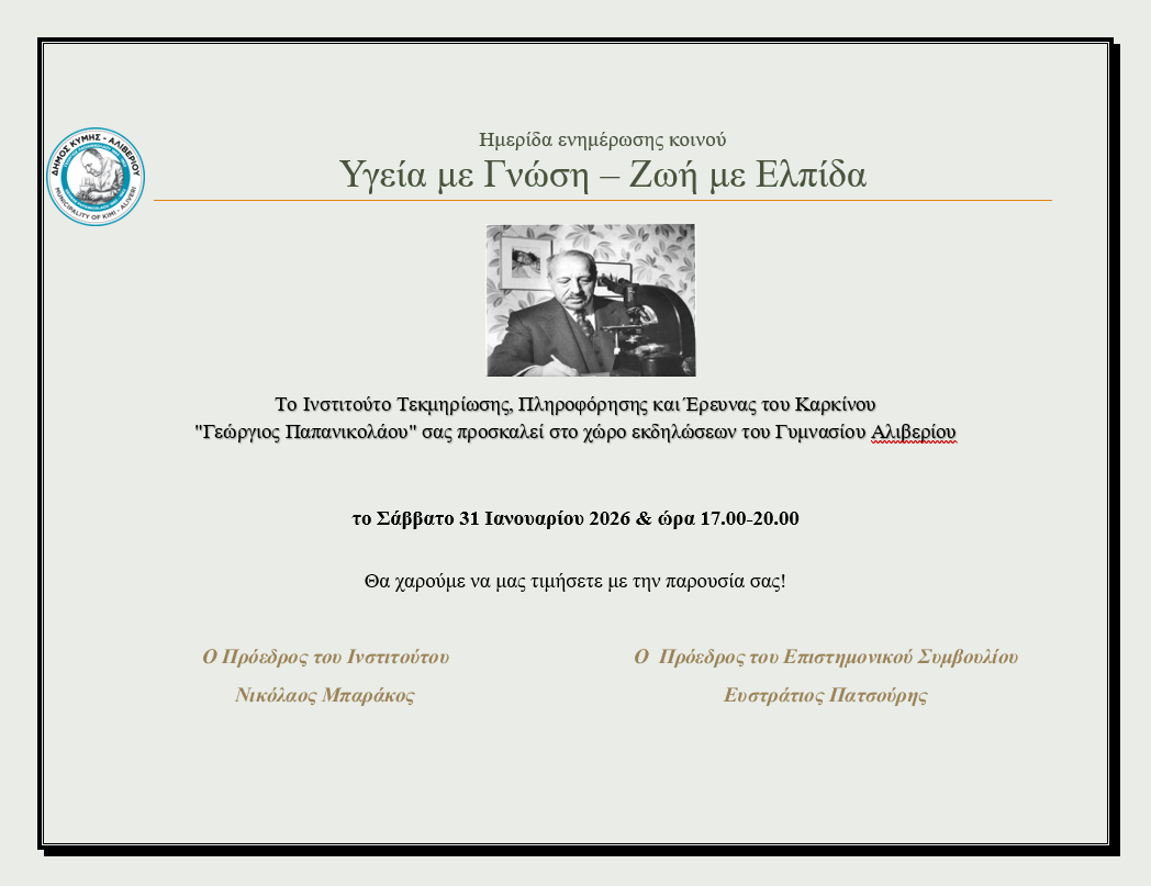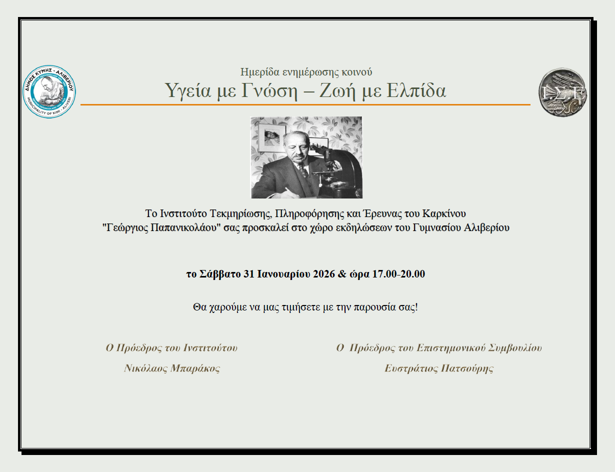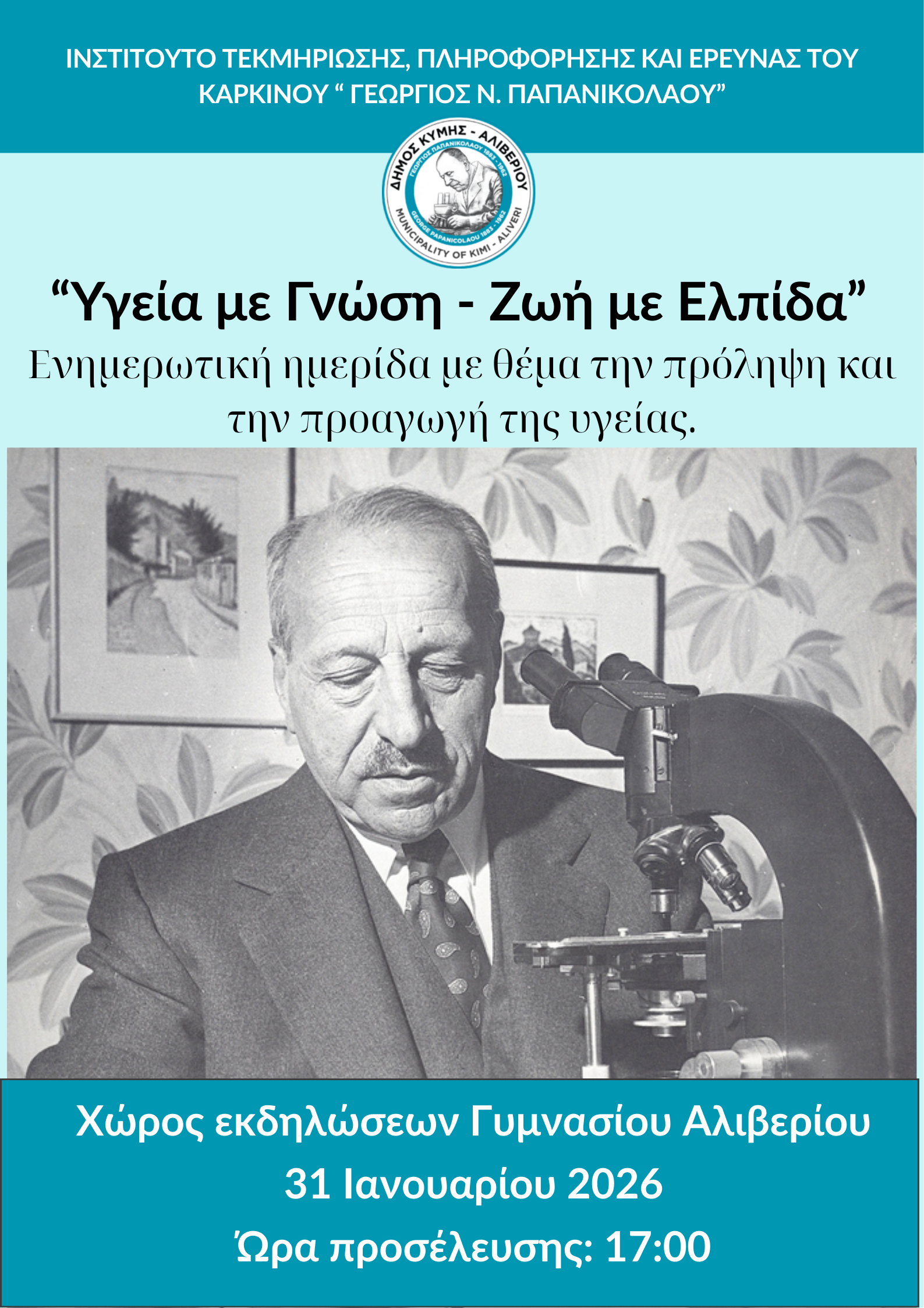 Το Ινστιτούτο Τεκμηρίωσης, Πληροφόρησης και Έρευνας του Καρκίνου «Γεώργιος Παπανικολάου» διοργανώνει ημερίδα ενημέρωσης κοινού με τίτλο «Υγεία με Γνώση – Ζωή με Ελπίδα», το Σάββατο 31 Ιανουαρίου 2026, στις 17:00 στον χώρο εκδηλώσεων του Γυμνασίου Αλιβερίου.
