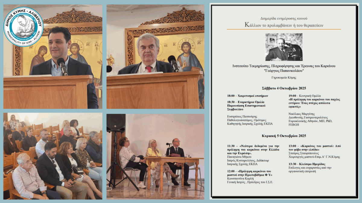 Με ιδιαίτερη επιτυχία πραγματοποιήθηκε η διημερίδα που διοργάνωσε το Ινστιτούτο Παπανικολάου του Δήμου Κύμης – Αλιβερίου, με θέμα «Κάλλιον το προλαμβάνειν ή το θεραπεύειν», το Σάββατο 4 και την Κυριακή 5 Οκτωβρίου, στην Κύμη.