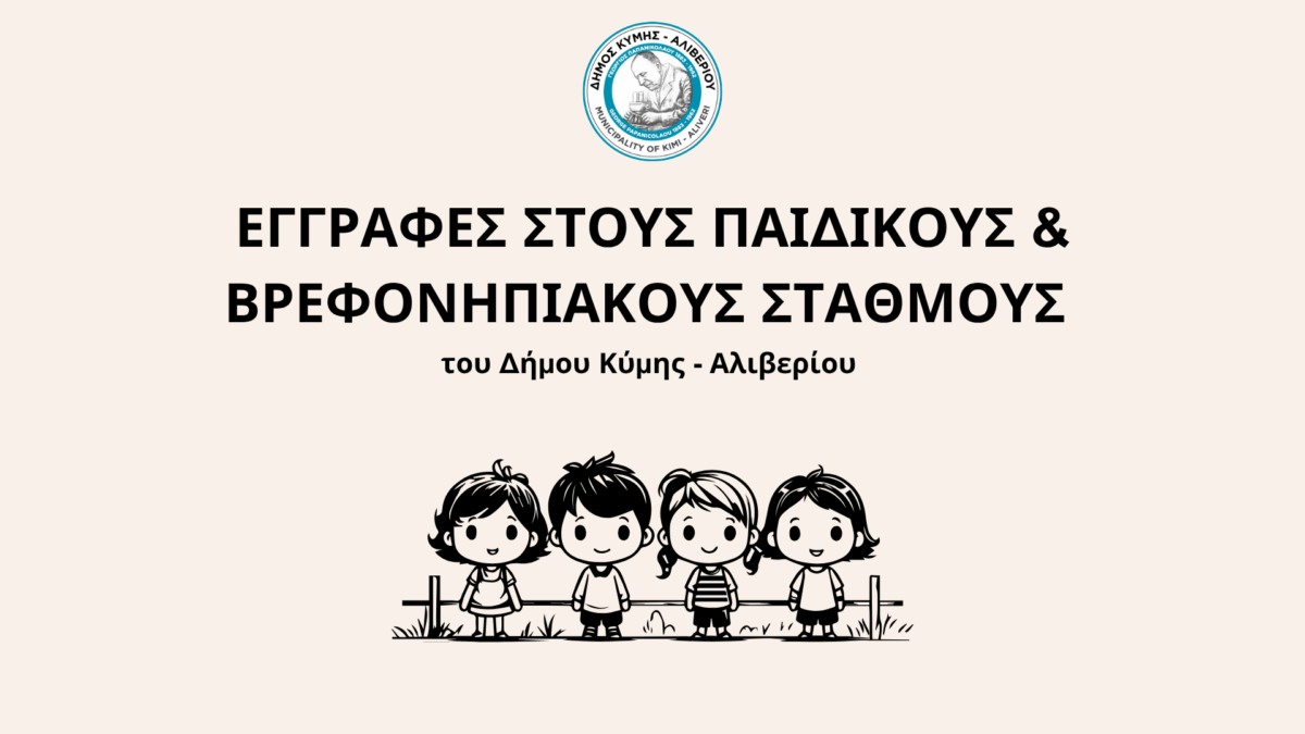 Ξεκινούν τη Δευτέρα 16 Ιουνίου 2025 οι αιτήσεις για τις εγγραφές στους Βρεφονηπιακούς και Παιδικούς Σταθμούς του Δήμου Κύμης – Αλιβερίου για το έτος 2025-2026.