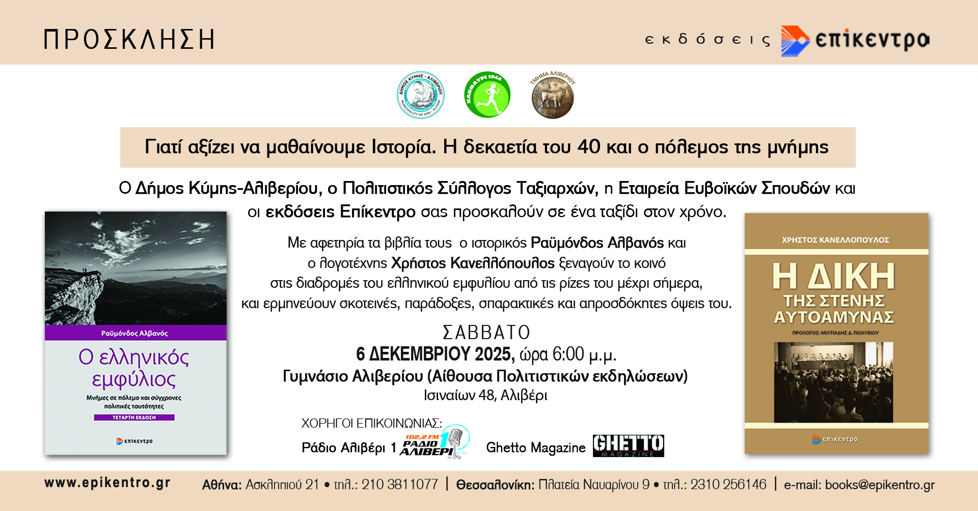 Ο Δήμος Κύμης – Αλιβερίου, ο Πολιτιστικός Σύλλογος Ταξιαρχών Κύμης, το Τμήμα Αλιβερίου της Εταιρείας Ευβοϊκών Σπουδών και οι Εκδόσεις Επίκεντρο σας προσκαλούν σε ένα μοναδικό ταξίδι στον χρόνο με θέμα: