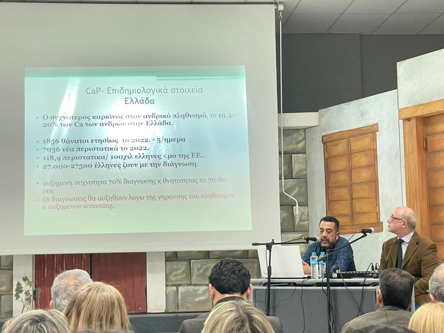 • Όσον αφορά στον καρκίνο του προστάτη, ο χειρούργος-ουρολόγος κ. Γ. Τσιμπούκης σημείωσε τη μεγάλη σημασία του καρκίνου του προστάτη στον ανδρικό πληθυσμό μιας και αποτελεί το συχνότερο καρκίνο σε αυτό τον πληθυσμό στην Ελλάδα. Τονίσθηκε η μεγάλη σημασία της πρωτογενούς και δευτερογενούς πρόληψης, η σημασία του ελέγχου για άνδρες μετά τα 50 έτη ή και μετά τα 45 αν υπάρχει οικογενειακό ιστορικό καρκίνου του προστάτη. Αναλύθηκαν οι διαγνωστικές και θεραπευτικές προσεγγίσεις και έγινε συζήτηση με το κοινό.