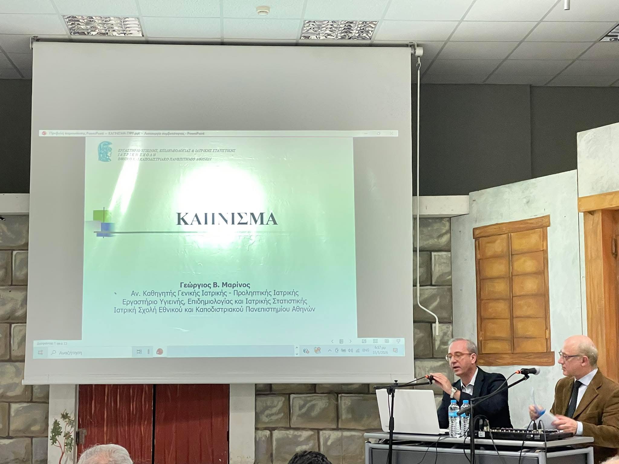 • Ο αναπληρωτής Καθηγητής Γενικής Ιατρικής-Προληπτικής Ιατρικής κ. Γ. Μαρίνος τόνισε τις βλαπτικές επιδράσεις όχι μόνο του κλασσικού καπνίσματος, αλλά και του παθητικού καπνίσματος και του καπνίσματος ηλεκτρονικών τσιγάρων – ενός φαινομένου με ιδιαίτερα δυσάρεστα επακόλουθα για τις νέες και νέους μας. Αναφέρθηκε επίσης στις πολιτικές που μπορούν να βοηθήσουν στον περιορισμό του καπνίσματος και ιδιαίτερα στη μεγάλη σημασία που έχει ο περιορισμός πρόσβασης σε καπνικά προϊόντα διαμέσου αύξησης των τιμών.