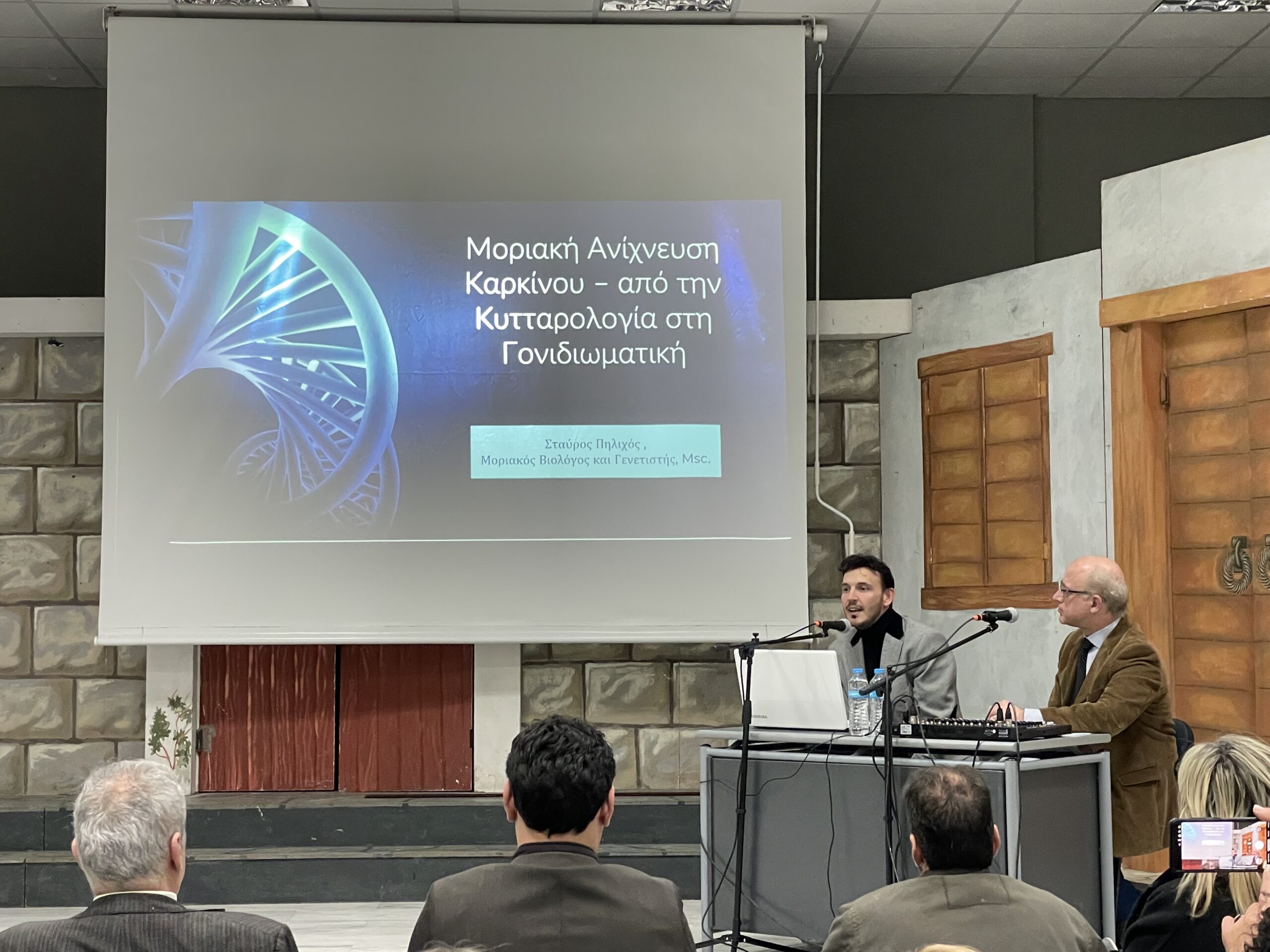 • Τέλος, ο μοριακός βιολόγος και γενετιστής κ. Σταύρος Πηλιχός ανέφερε τα διαφορετικά είδη γονιδίων που έχουν σημασία στο θέμα του καρκίνου, τόνισε τη σημασία των παραλλαγών σε αυτά τα γονίδια, ανέφερε συγκεκριμένα παραδείγματα μορφών καρκίνου που οφείλονται σε παραλλαγές γονιδίων και έδειξε το μέλλον της πρώιμης διάγνωσης του καρκίνου.
