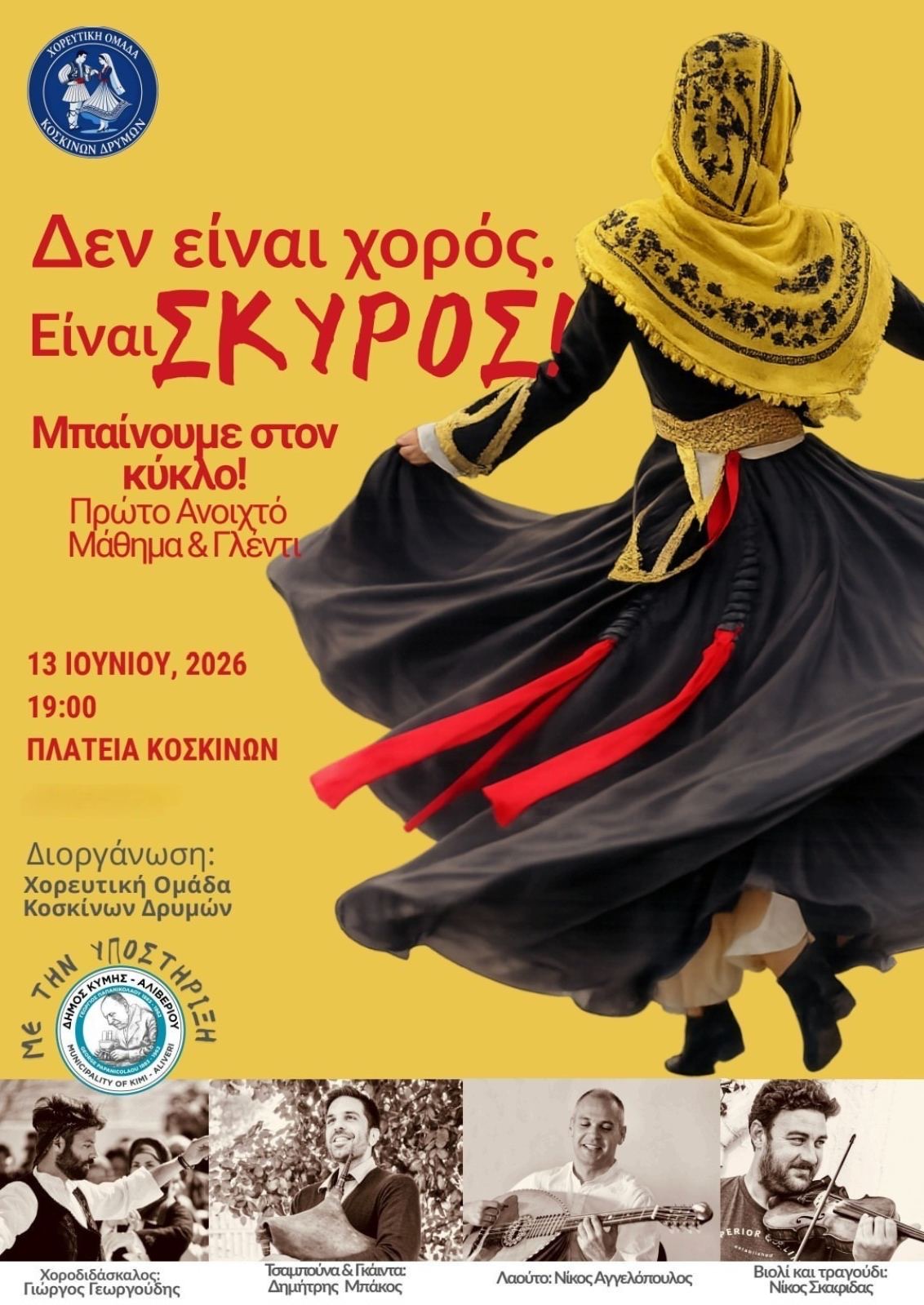 Η Χορευτική Ομάδα Κοσκίνων Δρυμών και ο Δήμος Κύμης Αλιβερίου, σας προσκαλεί στο πρώτο Ανοιχτό Μάθημα & Γλέντι Παραδοσιακών Χορών της Σκύρου, το Σάββατο 13 Ιουνίου 2026, στις 19:00, στην Πλατεία Κοσκίνων.