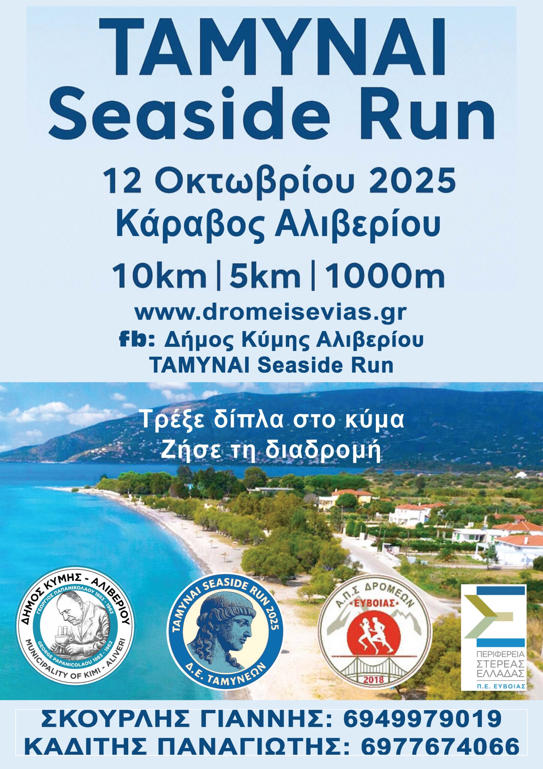 Ο Δήμος Κύμης-Αλιβερίου διοργανώνει τον Αγώνα Δρόμου: «ΤΑΜΥΝΑΙ Seaside Run» με την τεχνική υποστήριξη του Αθλητικού Πολιτιστικού Συλλόγου (ΑΠΣ) ΔΡΟΜΕΩΝ ΕΥΒΟΙΑΣ.